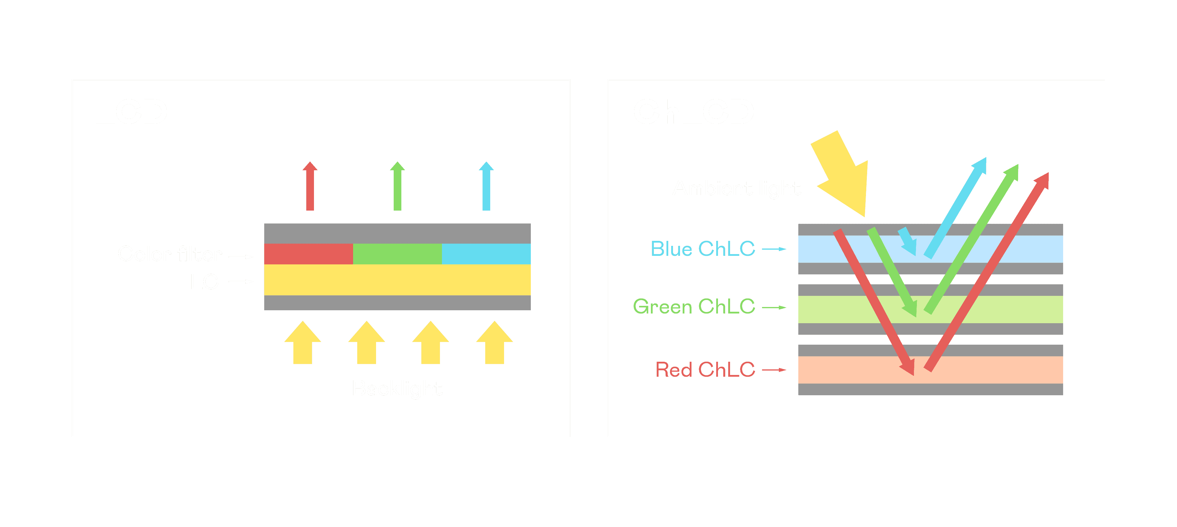 ChLCD 胆固醇液晶就如同纸张一样,,透过反射环境光来显示影像,,因此长时间观看不易造成人眼视觉疲劳,,,,可达到护眼效果。。。。当处于户外阳光下使用,,,LCD 影像容易失真而不易观看,,,,但胆固醇液晶仍可维持较佳的影像品质。。