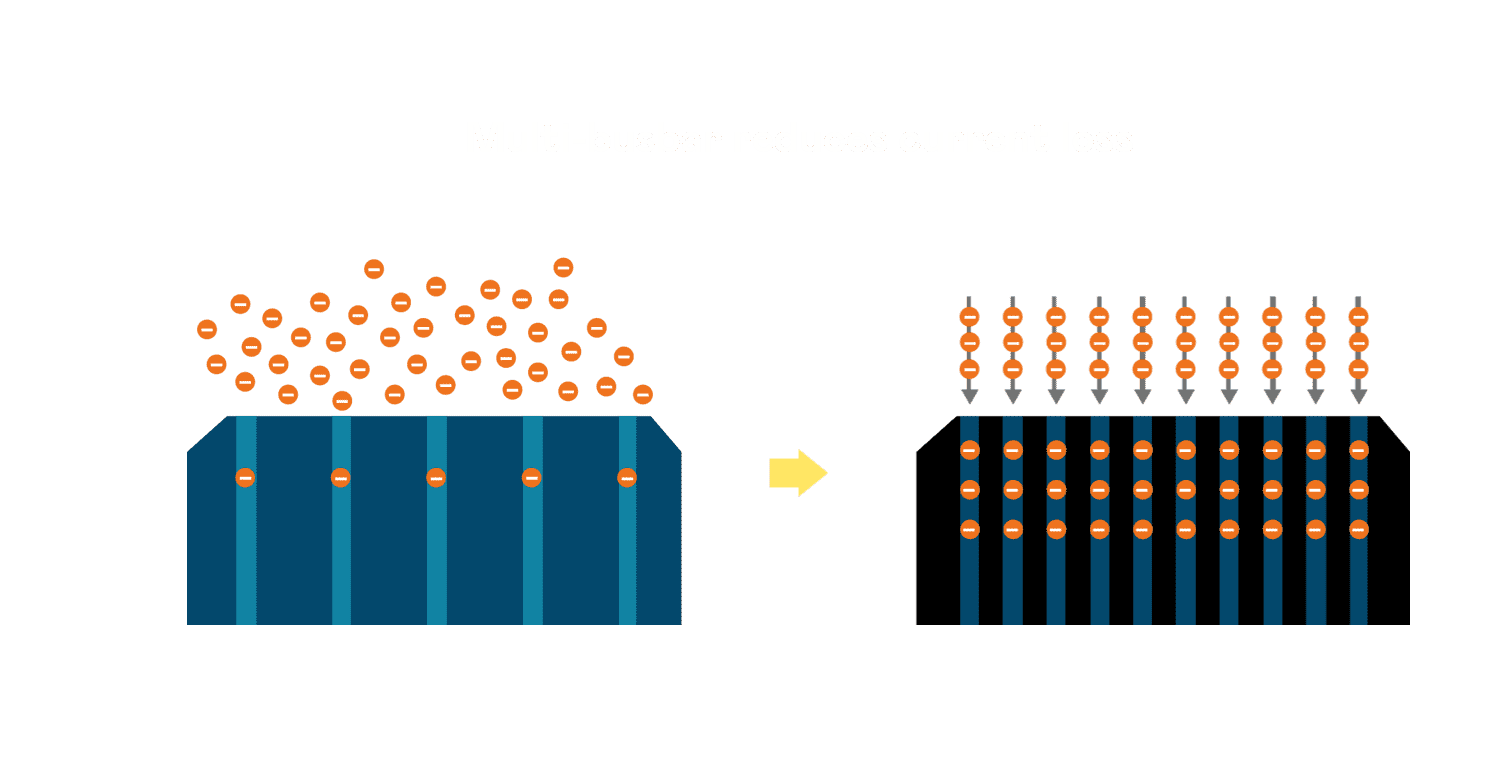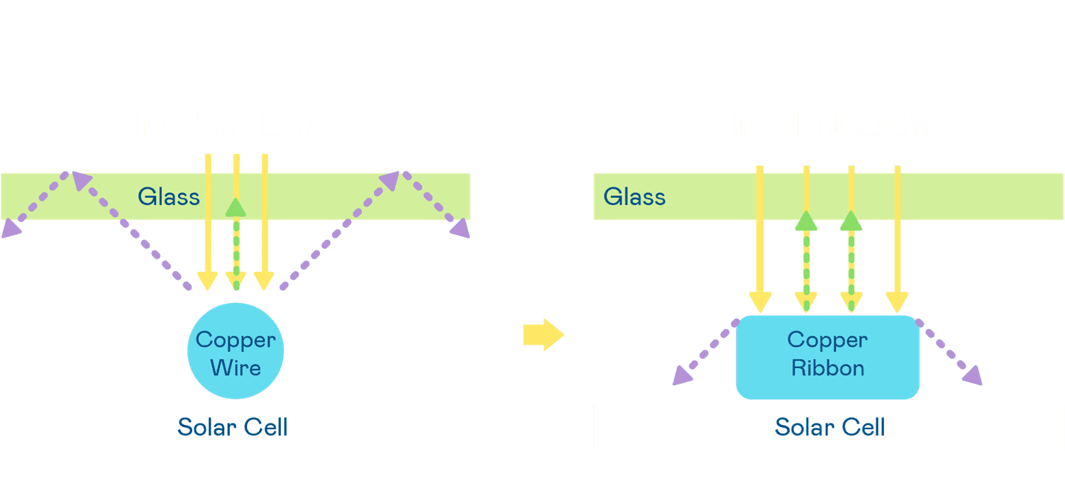 • 电池使用多条铜导线 (Copper wire) 于电池片上形成较短的电流路径,,提高电流收集效率,,采用圆形设计的铜导线较传统扁平式的铜焊带 (Ribbon),,,,可增加入射至电池的光线量。。。。