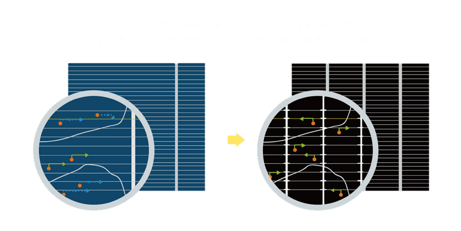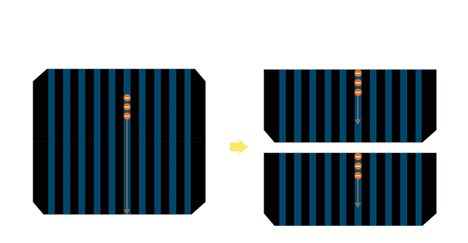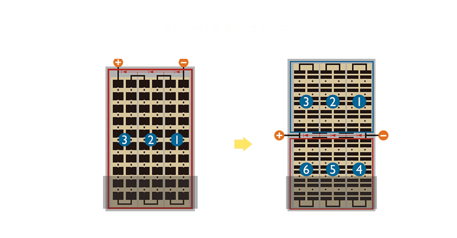 • 结合半切电池,,,降低遮阴影响、、、提升模组抗隐裂能力、、、并减少电阻损耗,,,进一步提升模组发电效能。。。